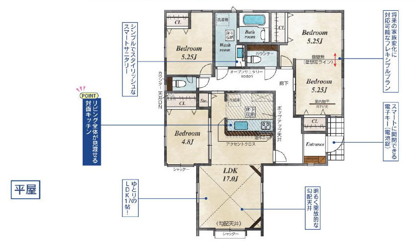 | 上尾市原市の新築一戸建て ★大変珍しい平屋の分譲住宅です。ご自分で注文住宅を建築する以外に、平屋を手に入れる方法は殆どないので、興味のある方はかならずご検討ください。それにしても久しぶりに販売されましたね ★敷地広々52坪以上! ★3LDKですが、壁を設置することで4LDKにも対応可能な設計です ★「子育てグリーン住宅支援事業」対象物件です ★埼玉新都市交通伊奈線(ニューシャトル線)沼南駅徒歩7分 ★南西道路に面しているため日当たり良好 ★LDK約17帖 ★4LDK可変型(10.5帖の洋室を、将来こども部屋として2つの部屋にアレンジできます/仕切壁工事は別途費用がかかります) ★ (はらいち団地地区)★荒川流域0.5から3m未満の浸水区域に該当しています ★原市台公園徒歩2分 ★第二産業道路へのアクセス良好です ★東栄住宅の家造り |