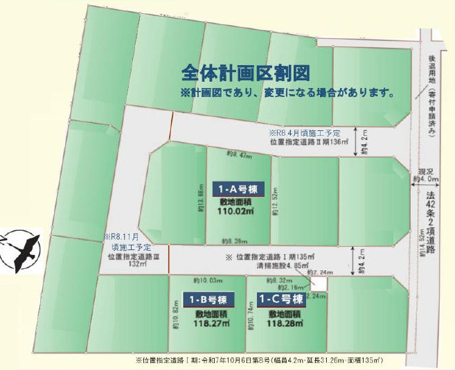 | 接道 | 南西 4.2m(幅員) 位置指定道路 8.39m(接面) 北東 4.2m(幅員) 位置指定道路 8.4m(接面) |