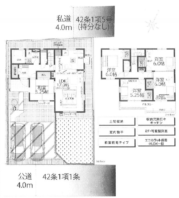特色 :駐車場、駐車場2台以上、公営水道、公共下水、プロパンガス、10年保証、住宅性能評価書取得(予定)、フラット35対応、浴室乾燥機、ウォッシュレット付トイレ、シャワー付き洗面化粧台、システムキッチン、TVモニター付インターホン、ペアガラス採用、耐震・免震構造、上、南道路