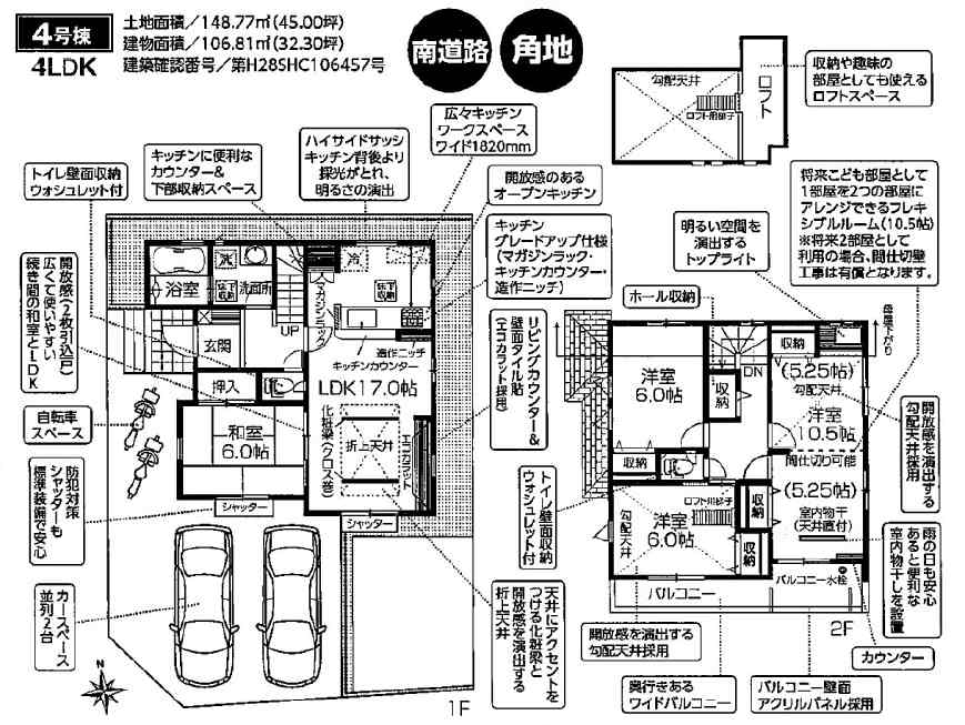 特色 :公営水道、浄化槽、プロパンガス、駐車場2台以上、住宅性能評価書取得(予定)、10年保証、フラット35対応、浴室乾燥機、ウォッシュレット付トイレ、シャワー付き洗面化粧台、システムキッチン、TVモニター付インターホン、ペアガラス採用、耐震・免震構造、角地、南道路
