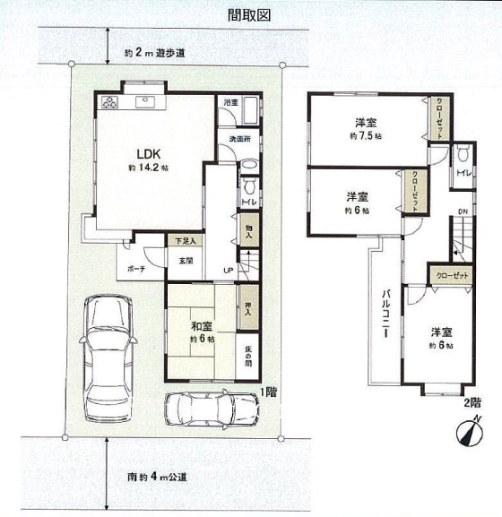 特色 :公営水道、南道路、都市ガス、公共下水、システムキッチン、両面道路、TVモニター付インターホン、駐車場2台以上